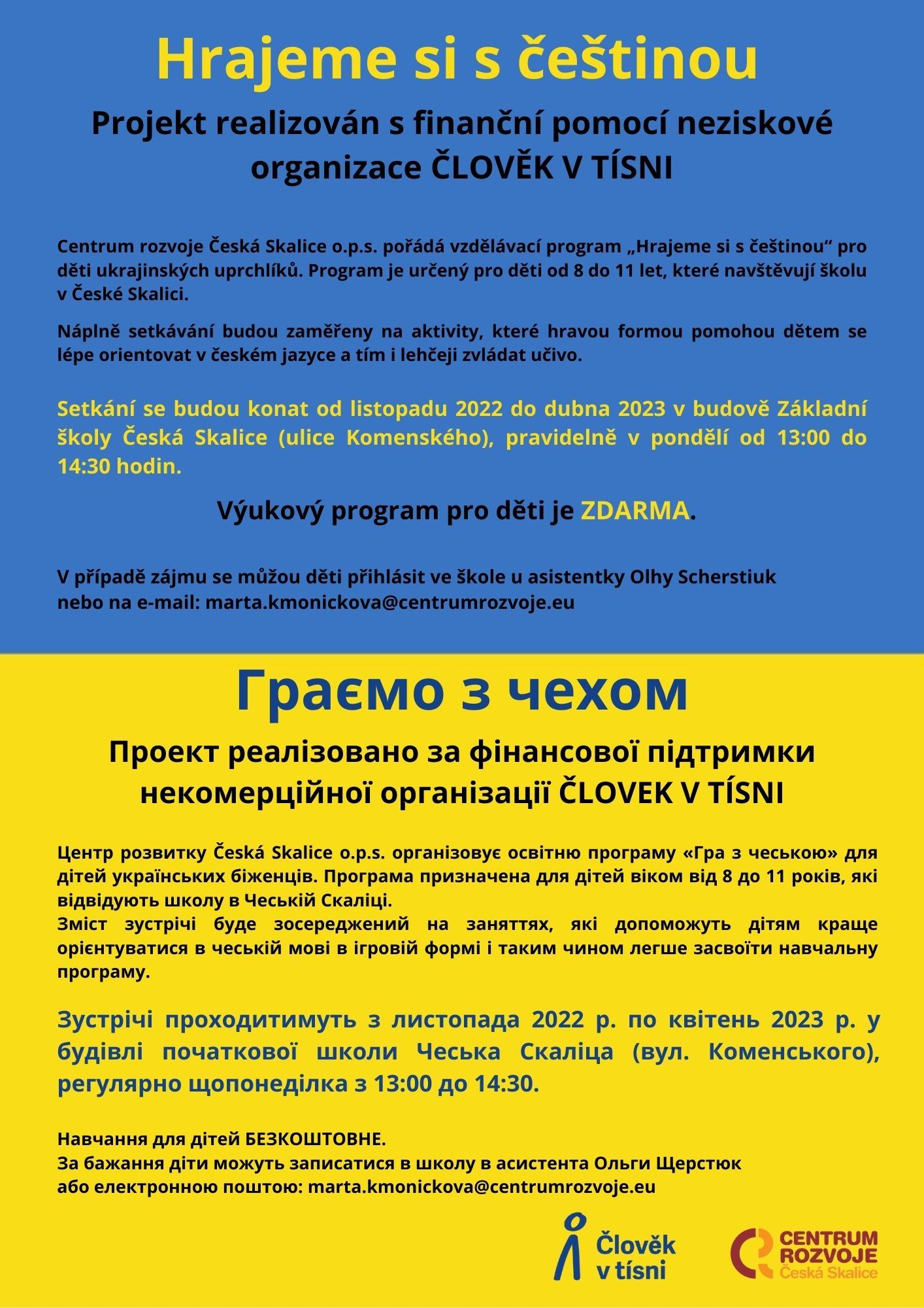 Centrum rozvoje Česká Skalice o.p.s. pořádá vzdělávací program „Hrajeme si s češtinou“ pro děti ukrajinských uprchlíků. Program je určený pro děti od 8 do 11 let, které navštěvují školu v České Skalici.
