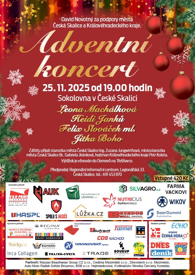 David Novotný za podpory města Česká Skalice a Královéhradeckého kraje pořádá tradiční koncert. Vystoupí Leona Machálková, Heidi Janků, Felix Slováček ml. a Jitka Boho. Záštitu nad koncertem přijali starostka města Česká Skalice Zuzana Jungwirthová, místostarostka Gabriela Jiránková, hejtman Královéhradeckého kraje Petr Koleta. Výtěžek bude věnován do Domovů Na Třešňovce. Předprodej v Informačním centru Česká Skalice od 1. listopadu 2025. Vstupné 420 Kč.