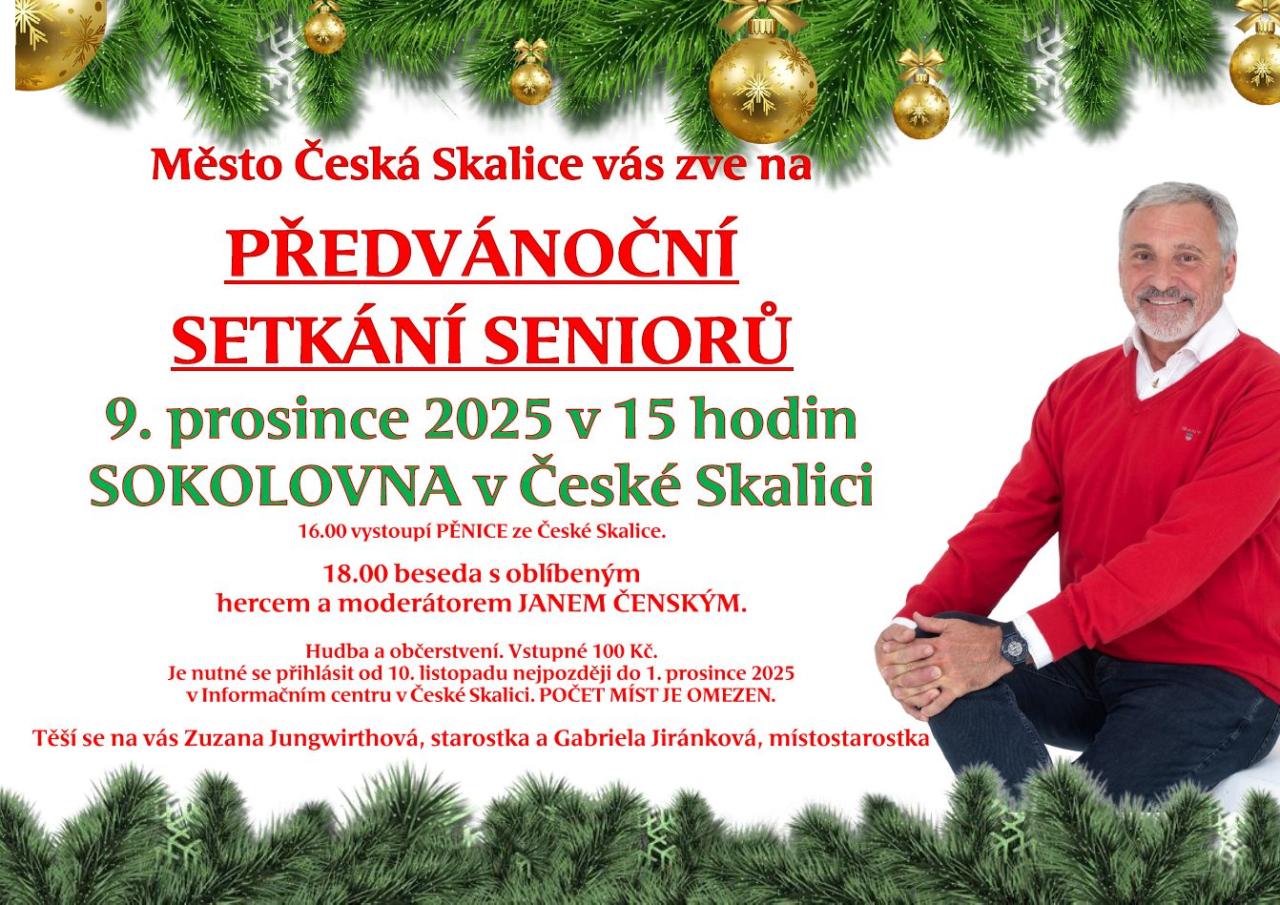 Město Česká Skalice vás zve na předvánoční setkání seniorů. Od 16 hodin vystoupí Pěnice ze České Skalice. Od 18 hodin bude následovat beseda s oblíbeným hercem Janem Čenským. Hudba a občerstvení. Vstupné 100 Kč. Je nutné se přihlásit od 10. listopadu nejpozději do 1. prosince 2025 v Informačním centru v České Skalici.