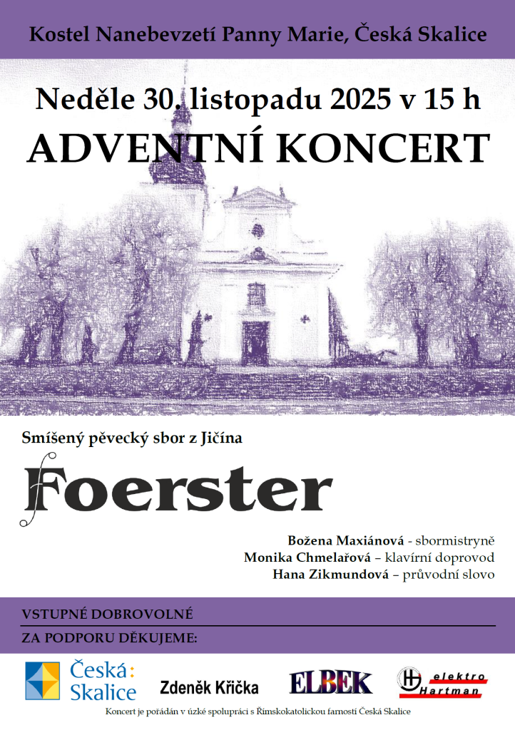Vystoupí smíšený pěvecký sbor Foerster z Jičína, Božena Maxiánová – sbormistryně, Monika Chmelařová – klavírní doprovod, Hana Zikmundová – průvodní slovo. Vstupné dobrovolné. Akce se koná za podpory města Česká Skalice.