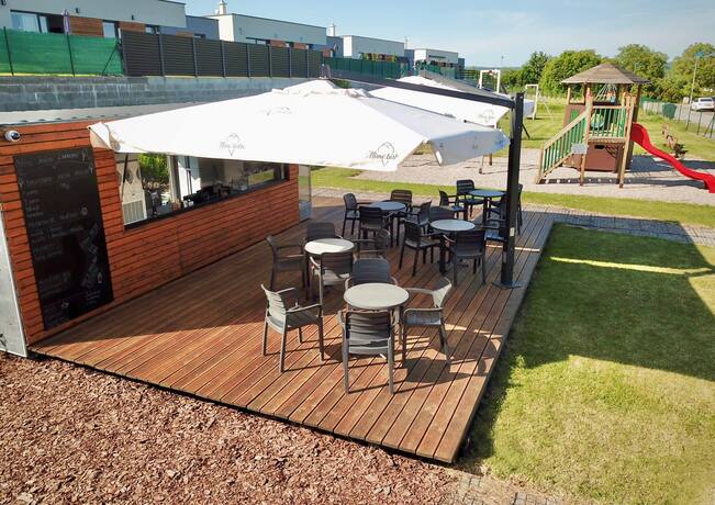 Vše si vychutnáte na venkovním posezení s příjemnou atmosférou a dětským hřištěm.