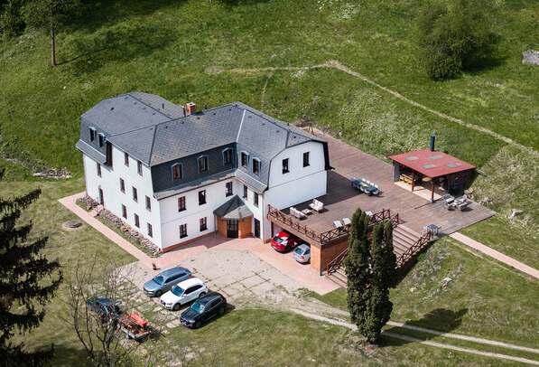 Objekt nabízí: absolutní soukromí, kde nebudete svými oslavami nikoho rušit, oplocený udržovaný pozemek o velikosti 10 000 m², např. Na svatební stan, velkorysou osvětlenou terasu, na které je designový Altán a parkoviště pro cca 10 vozů. Vybavení domu: ubytování pro 17 osob v 7 ložnicích (6x dvoulůžková, 1x pětilůžková) ve dvou patrech o celkové rozloze 310m2 spojených centrálním schodištěm - přízemní apartmá je bezbariérové, 3x koupelna, 3x WC. Ve společenské místnosti je televize s úhlopříčkou 170 Cm vč. MAGENTA TV, kulečník o sportovní velikosti 9 stop s novým plátnem, krbová kamna a fotbálek. Dále je k dispozici 2 x nová kuch. Linka na míru s vestavěnými spotřebiči - 2x lednice, 1x myčka, 1x veliká indukce, 2x trouba, 2x mwt, 1x plně automatický kávovar SIEMENS s plným zásobníkem zrnkové kávy, 2x rychlovarná konvice, pračka, žehlička a sušák na prádlo.
