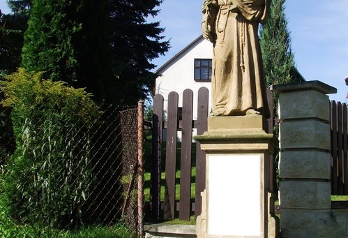 Socha znázorňuje muže s růžencem a dítětem.