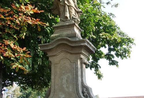 Barokní socha světce v životní velikosti s knihou v levé ruce, pravou ruku klade k srdci, oděn v rozevlátý šat stojí na křižovatce silnic na Chvalkovice, Miskolezy a Sebuč. Je považována za dílo místního sochaře, obeznámeného s vrcholnými díly českého baroka.